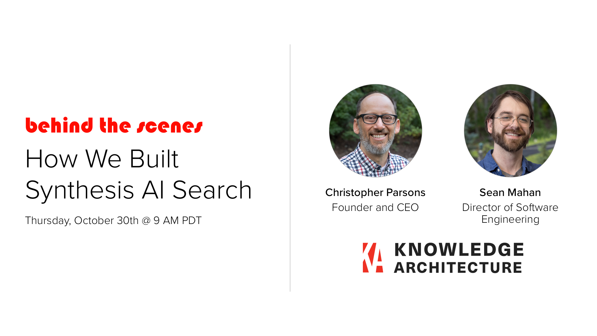 In this behind-the-scenes session, Christopher Parsons (Founder and CEO) and Sean Mahan (Director of Software Engineering) share how Knowledge Architecture designed and built Synthesis AI Search, tracing its evolution through multiple generations of design and engineering. You’ll see the real problems they set out to solve, the obstacles they overcame, and the lessons they learned along the way.